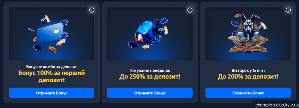 Казино пропонує різні види бонусів: від вітального до регулярного Чемпіон казино персональний бонус. Серед них: вітальний бонус на перший депозит, щотижневі подарунки та промоакції з спінами.